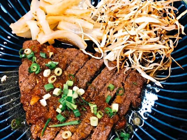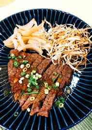 ステーキ 和風ソース 付け合わせは揚げ牛蒡 里芋のゆず味噌 オクラの