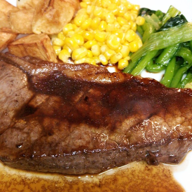 今晩の Gohan は 和牛サーロインステーキ 付け合わせは小松菜と舞茸