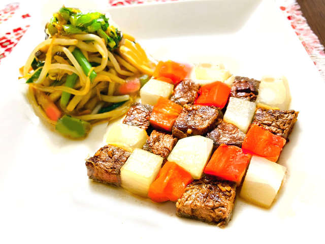 美味しいサイコロステーキと付け合わせの野菜 みずいろにっき