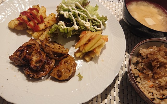 和風ハンバーグ長ネギのせ レンコンチップ 献立 七じゃむのたべもの日記